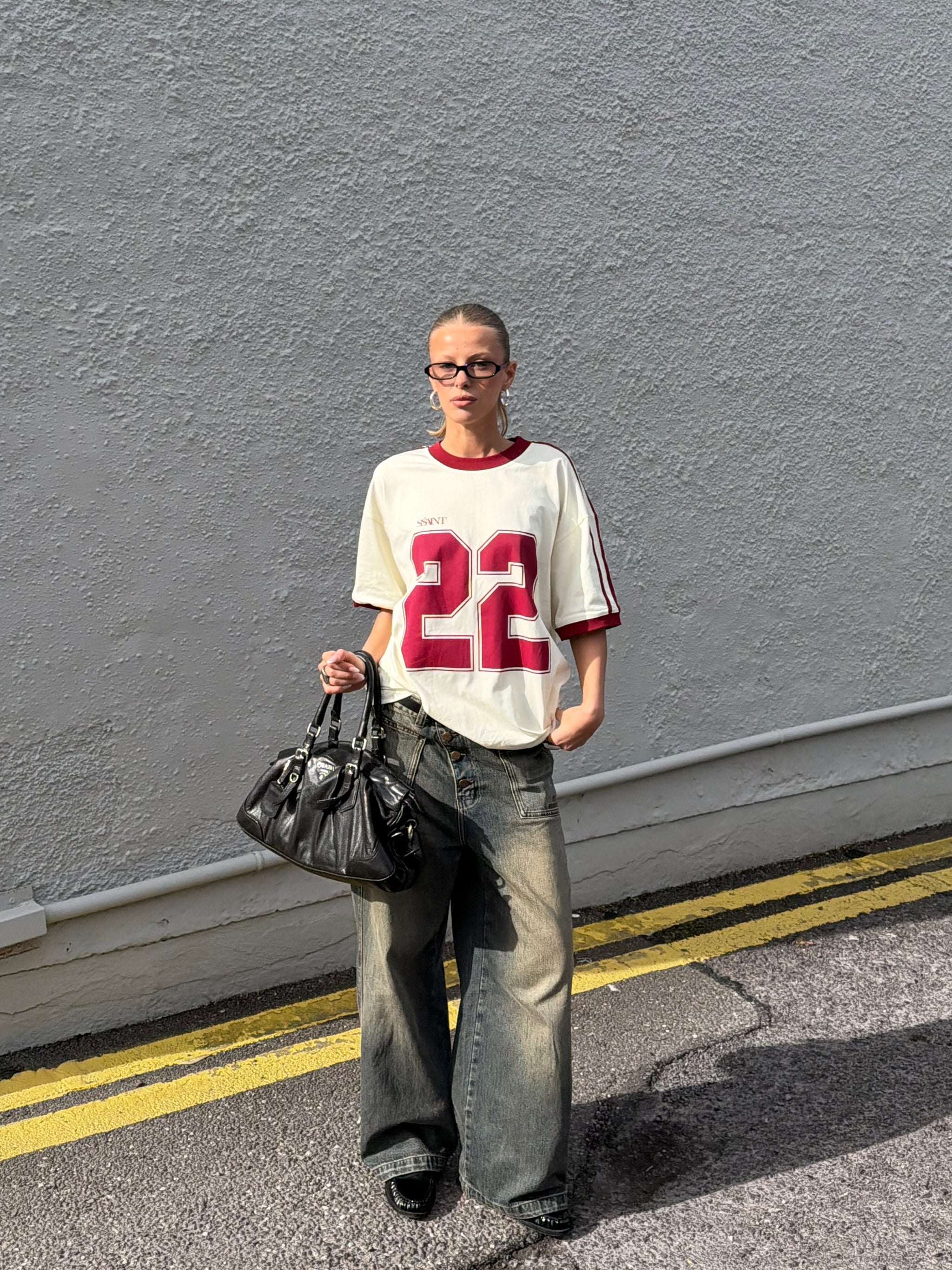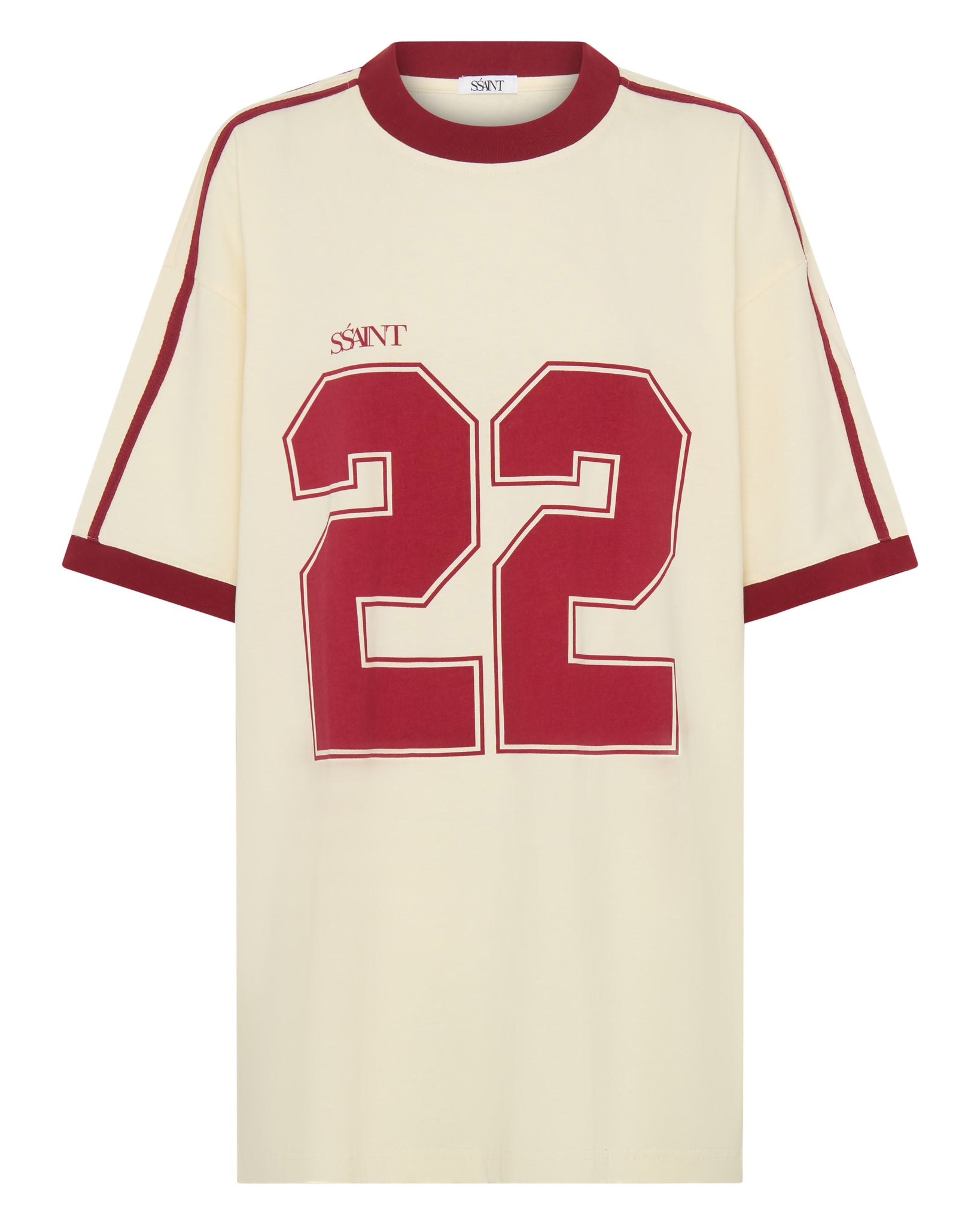 Gear up with the Twenty Two Tee, an oversized unisex design that pays tribute to our iconic Twenty Two fragrance. This statement tee features a soft cream base with bold cherry-red 22 numbers on the front, finished with matching cherry ribbed trims and stripe detailing along the shoulders and sleeves for a vintage football jersey–inspired look.
