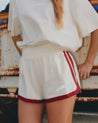 A modern take on the retro sport short. Designed with a relaxed fit, contrast trim, and elastic waistband for everyday comfort. Featuring the signature SŚAINT silver reflective logo, these shorts are versatile enough to wear from lounge to street.