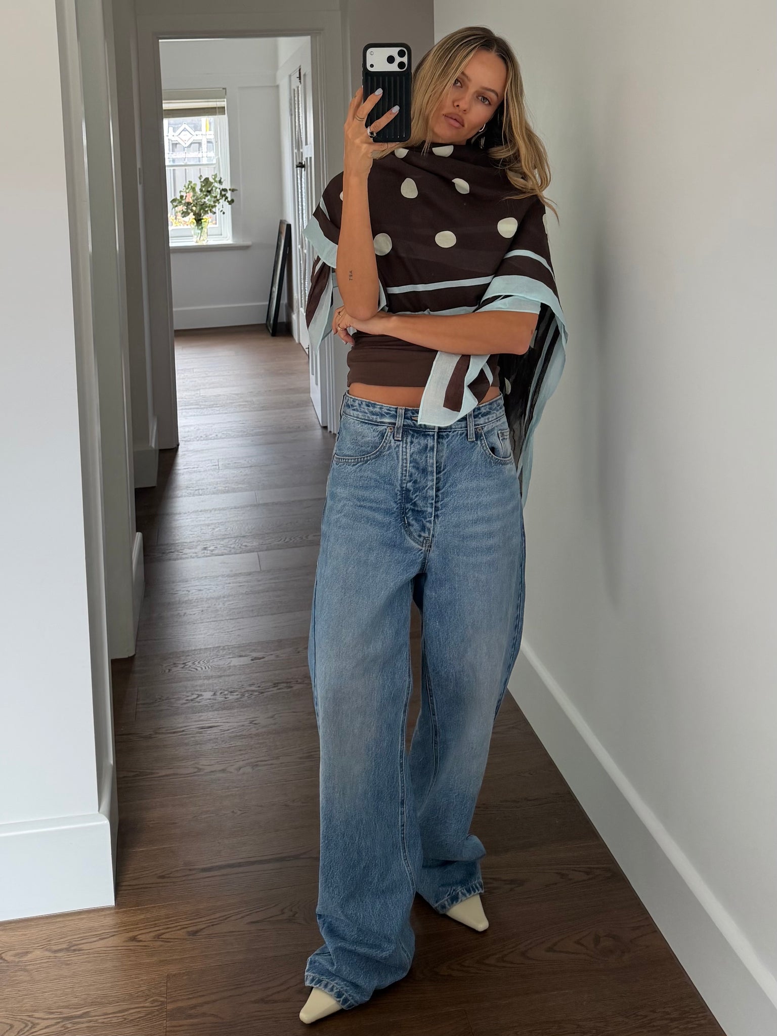 Lilli styles it back with our Polka headscarf and Espresso Essentials Tank.